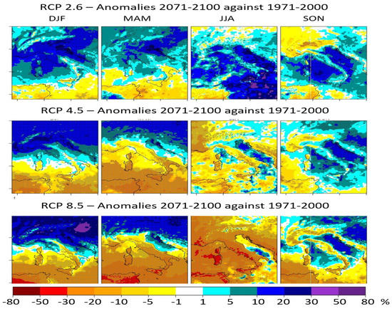 In the middle of the century (Figure 7), precipitations will likely decrease even more in summer and spring (in this case, only in Southern Italy) ranging between 10 and 20% in RCP 4.5 and RCP 8.5.