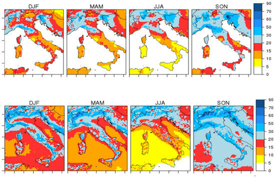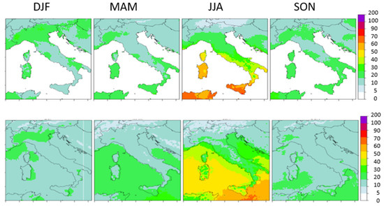 For this purpose, first, the 99th percentile (RR99) fields have been computed at seasonal scale by using both E-OBS and MMM data. Figure 13 allows for comparison between the corresponding seasonal RR99 patterns. It is worth noting that the MMM seasonal reconstructions are wetter than the corresponding E-OBS scenarios over Southern Italy, with overestimations that reach up to 100%. However, the multi-model pattern is able to satisfactorily describe the main characteristics of the precipitation regime by identifying the northern regions as the wettest in Italy, as well as the season cycle, with summer as the driest season and autumn as the wettest.