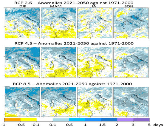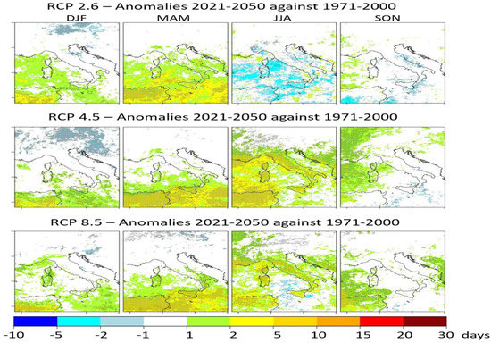 In general, no signal highlights changes in drought conditions under the RCP 2.6 configuration. Instead, the maximum length of dry spell is expected to grow significantly, above all in summer in Southern Italy in the RCP 4.5 and RCP 8.5 hypothesis. The stippled region highlights a significant increase in CDD, ranging from 2 to 10 days, over much of Italy during the summer.