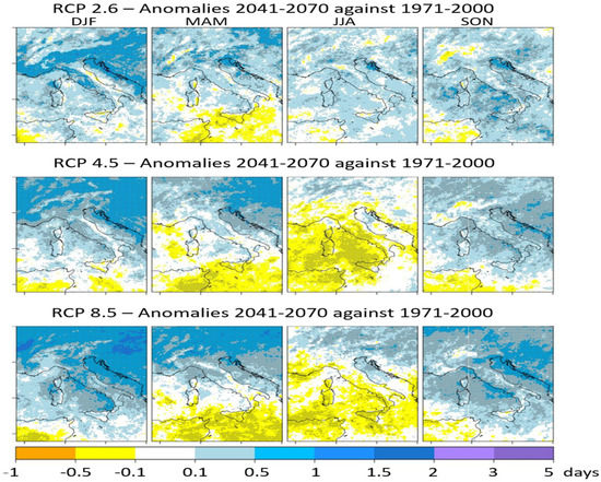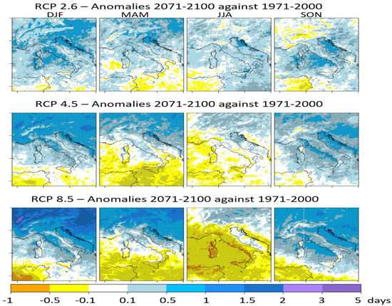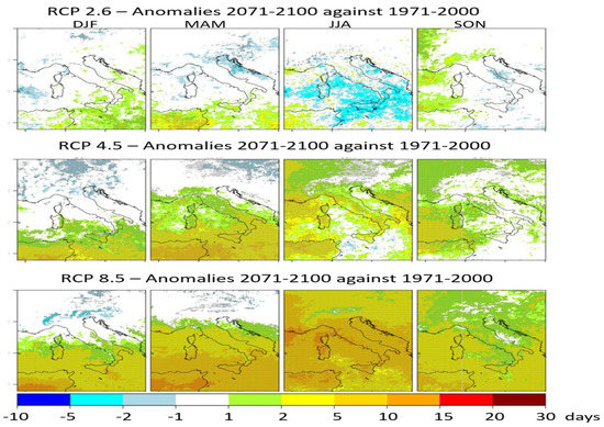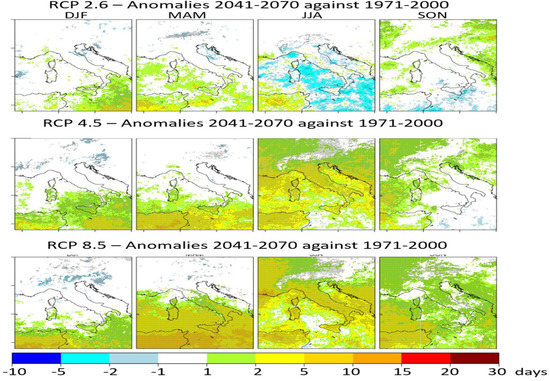 Under RCP 4.5 and RCP 8.5 configurations, a lengthening of CDD is expected in spring and autumn, with values ranging from 2 (RCP 4.5) to 5 (RCP 8.5) days after the middle of the century. This may be particularly worrying in spring because increasing drought conditions may seriously impact the agricultural sector.