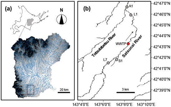 Location of the Tokachi watershed in Hokkaido, Japan where the study area is indicated by a dotted box (a) and four study sites (gray-filled circles) in the Satsunai River (b). A red-filled point indicates the confluence with a tributary affected by a wastewater treatment plant (WWTP). An arrow denotes the flow direction of the river.