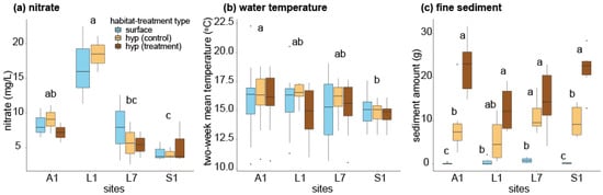 Comparisons of nitrate (a), water temperature (b), and fine sediment (c) in relation to habitat-treatment types. Alphabetical letters denote results of multiple comparisons based on GLMM; those with the same letters were statistically undistinguishable. Multiple comparisons were performed among sites for nitrate and temperature and among habitat-type groups within each site for fine sediment.