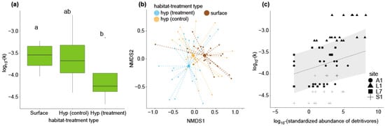 Comparisons of log10-transformed leaf litter decomposition rate (k) in relation to the habitat-treatment types (a), biplots as a result of NMDS (b), and a relationship between the log10-transformed abundance of detritivores and k (c). In (a), alphabetical letters denote results of multiple comparisons based on GLMM; those with the same letters were statistically undistinguishable. Multiple comparisons were performed among sites. In (b), large circles represent centroids of data points for each habitat-treatment group. In (c), a regression line based on a GLMM and 95% confidence intervals are shown.
