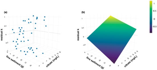 A three-dimensional plot for raw residual k in relation to nitrate and fine sediment (a) and a projected surface model based on the results of GLMM (b).