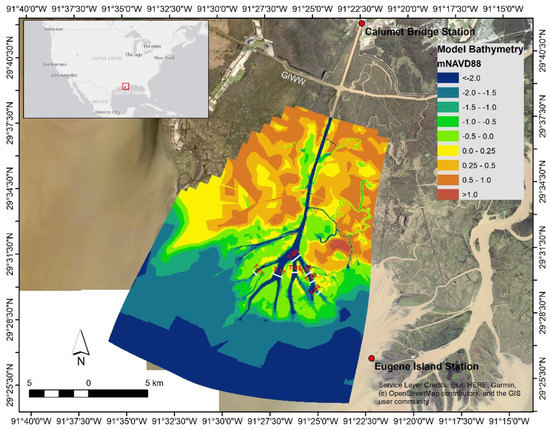 The WLO receives 40–50% of the Atchafalaya River flow. Water and sediment discharge vary seasonally with high discharge usually occurring between January and June [29]. Based on the record from 1986 to 2014 at the USGS gauging station on the WLO at Calumet Bridge, the annual average flow is 2520 m3/s. The minimum monthly flow typically occurs during the month of September and is about 1270 m3/s, and the peak monthly flow occurs during the month of April and is approximately 3640 m3/s. During the high-flow season, the average velocities in the channel network are in the range of 2 to 2.5 m/s, whereas suspended sediment concentrations are 20 times higher than those during the low-flow season [32]. Under normal conditions, tides and wind-driven waves in the Atchafalaya Bay are typically mild. Tides are mixed diurnal with an average amplitude of approximately 30 cm [32]. The significant wave height rarely exceeds 0.5 m [2,8].