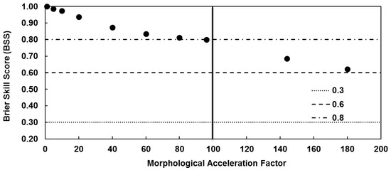 The depth-averaged model was calibrated and validated using the same dataset described above. To gain computational speed, a time dilation and Morphological Acceleration Factor (MORFAC) technique was used for long-term morphodynamic simulations [34,46]. Time dilation was achieved by approximating each day as 24 min of simulation and the resulting morphological change in sediment fluxes for each time step was multiplied by a MORFAC value of 60. This value was selected based on previous studies [46,47], in addition to sensitivity tests that were performed using a simplified model with similar grid resolution and flow conditions to confirm that the acceleration factor did not produce significant bias in results. A statistical parameter Brier Skill Score (BSS) was used for assessment of the acceleration factors from 1 to 180 (Figure 2). The BSS between the reference simulation (MORFAC = 1) and a simulation with MORFAC > 1 higher than 0.8 is considered to be excellent to capture the morphological changes in complex engineering model application [48].