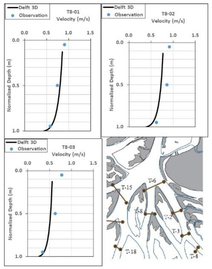 Velocity and total suspended sediment measurements made in the WLD channels during 2000–2001 formed the basis for the calibration and validation of the hydrodynamic and sediment transport components of the model (Figure 1) [32]. Each measured transect contains several sample points, and at each point, measurements of velocity and total suspended sediment concentrations were taken at 0.05, 0.5, and 0.95 of the total depth [8,32]. The morphodynamic component was calibrated against the delta growth rate estimated by recent studies [30,31,44].