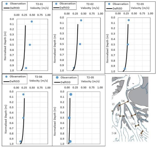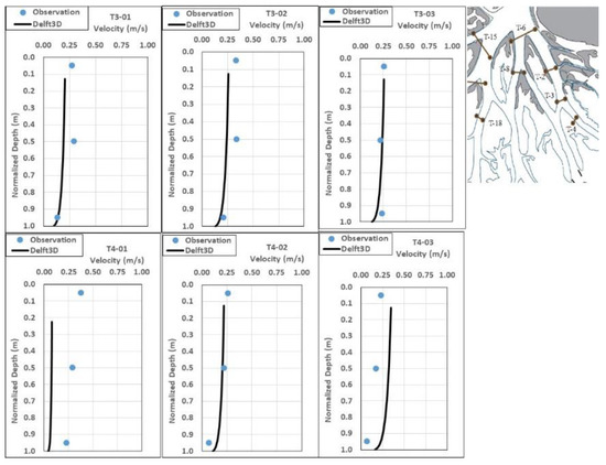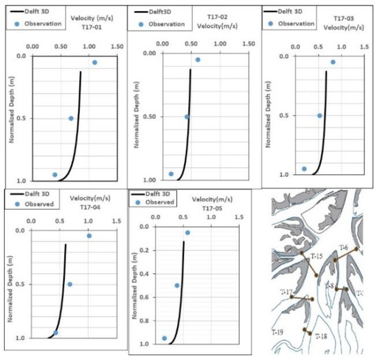 Comparison of modeled and measured (ADCP) velocities at select distributary channel locations—see Figure A1 for locations.