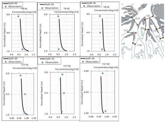 Steady-state 3D model: The simulated vertical velocity profiles compare well with the field observations (see Figure 3, Figure 4, Figure 5, Figure 6 and Figure 7). Similarly, comparison of the simulated and observed suspended sediment concentration at each sample point of the available transects were made for both the 3D and 2D models (see example in Figure 8). It should be also noted that additional calibration and validation of the hydrodynamic component of this model under unsteady conditions have been performed and showed good comparison with field observations [49]. Further, additional comparisons between modeled and measured water level, discharge, and velocity are included in Appendix A.