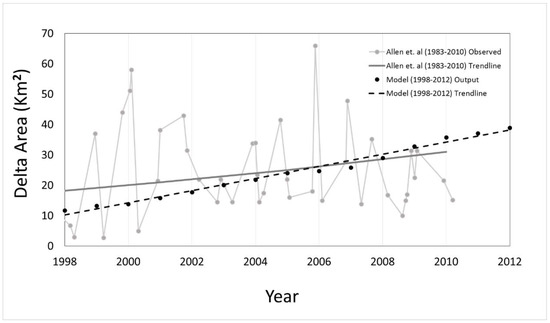 Land change trends for Wax Lake Delta (in km2). The model predicted delta areas are represented by black circles and the delta growth trend line is represented by black dashed lines. Observed delta area is represented by grey circles and the trend line is represented by solid grey line.