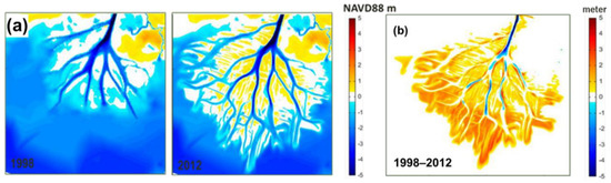 (a) Simulated topography of the Wax Lake Delta from 1998 to 2012. (b) Simulated cumulative erosion/deposition pattern in the Wax Lake Delta during 1998–2012.