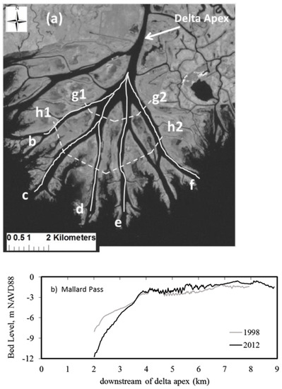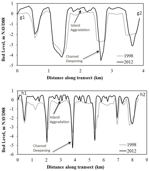 Figure 12g,h shows two cross-section profiles—transects g1–g2 and h1–h2 at radial distances of approximately 4 and 7 km, respectively, from the delta apex, passing through several islands and channels. The transects show that although the islands have aggraded over time, the distributary channels have incised and become narrower due to accretion near the channel banks. Aerial images between 1991 and 2009 showed that some channels narrowed over time, but there was a net widening of channels during this period [41]. The Delft3D model presented herein does not account for channel bank movements caused by significant erosion into the adjacent cells. This might explain why the model did not show widening of the channels, even when significant erosion develops into adjacent cells. However, development of advanced Delft3D schemes addressing bank line migration is in progress [51,52], and can be included in subsequent studies.
