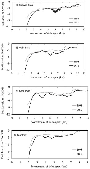 The 2D model results demonstrate the morphological development in the WLD distributary channels during 1998–2012. Longitudinal transects (Figure 12b–f) shows that the distributary channels in general have become deeper over time due to erosion. The erosion is at a maximum near the delta apex and decreases downstream. The model result suggests that the distributary channels become depositional approximately 6–8 km downstream of the apex. However, the extent and magnitude of erosion varies among channels. Shaw et al. [41] presented a similar trend in WLD channel morphology. Their findings were based on comparison between bathymetric transects from 1999 and pre-delta bathymetry from 1935.