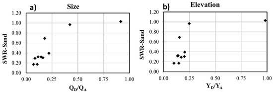 The impact of the distributary channel geometry on the sediment capturing efficiency was investigated by plotting the SWR against the capacity of the channel (ratio of flow at channel (QD) and delta apex (QA)) and depth (ratio of channel depth (YD) and depth at delta apex (YA)), as shown in Figure 13.