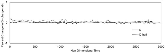 The percent change in discharge ratio at the bifurcation downstream of the Wax Lake delta apex. Q = the actual flow rates of the WLD from 1998–2012, and Q-half = the flow rates from 1998–2012 are reduced by 50%.