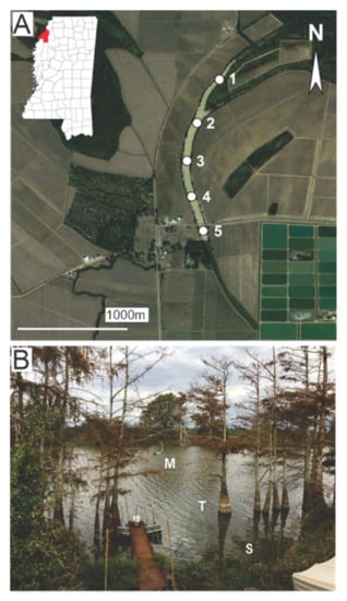 (A) Five sample sites (filled circles) established longitudinally from north (upstream) to south (downstream) within Roundaway Lake, Coahoma County, Mississippi, USA. (B) Photograph of Roundaway Lake site 3 showing the bald cypress (Taxodium distichum (L.) Rich.) tree line and relative spacing of mid-lake (M), tree line (T), and shore (S) sediment samples.