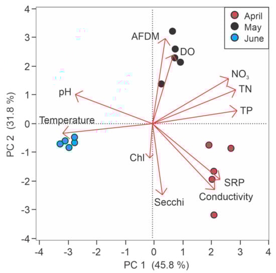Water quality differences among sampling months (April, May, June) in Roundaway Lake, MS. Circles represent sites and colors represent months, with closer sites being more similar in water quality. Arrows denote the variable loadings and strengths (arrow length) relative to each principal component. The principal component analysis shows water quality segregated more by month than by location in the lake, and differences are driven mainly by temperature, nutrients, water clarity, dissolved oxygen (DO), and suspended organic matter (ash-free dry mass, AFDM).