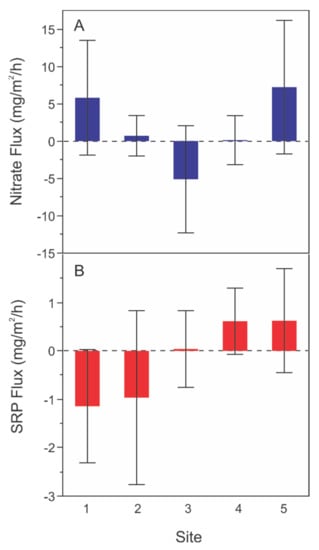 Sediment core (A) nitrate and (B) soluble reactive phosphate (SRP) flux rates by site for all months and depth habitats combined at each site. Negative values indicate a movement of nitrate or SRP from the water to the sediments and positive values indicate nitrate or SRP release from the sediments into the water. Bars are the means across depths and months, and error bars are 95% confidence intervals.