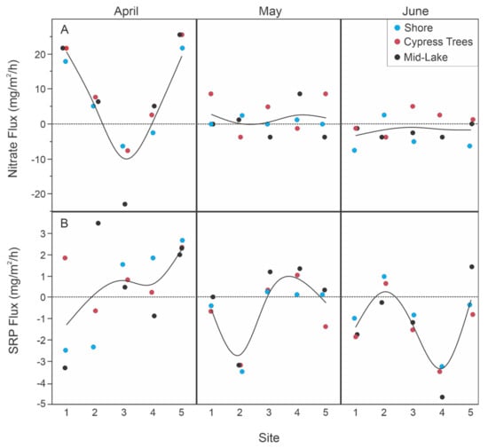 Sediment core nutrient flux in Roundaway Lake differed over space and time, with some areas removing NO3− and SRP (negative flux rates from the water) and some areas releasing it (positive flux rates into the water) during the same sampling period. There was a significant month by site interaction for both NO3− (p < 0.001) and SRP (p < 0.001) fluxes that did not allow a robust assessment of differences among sites (Table 1). However, there were discernable spatial and temporal trends in the data. Across all months and depth habitats, average NO3− flux into the sediments was greatest at mid-lake, site 3, switching to an average release from sediments in both upstream and downstream directions (Figure 3A, Table S2). SRP was generally moving into the sediments at the upstream sites with gradual shift to sediments releasing SRP with distance downstream (Figure 3B). However, because 95% confidence interval included zero, it is not clear that any site was consistently retaining or releasing nutrients throughout the study, and uptake had considerable variation from month to month in the spring. Ambient NO3− and SRP flux rates were substantially more variable in April, both within and among sites (Figure 4). During April, sediments released NO3− at the most upstream and downstream locations but removed NO3− at the mid-lake site. The most extreme NO3− flux rates were recorded in April, where rates ranged from −25.5 mg/m2/h at site 3, to 22.9 mg/m2/h at site 5, with an average flux rate of 5.5 mg/m2/h from sediments across all sites. Nitrate flux rates became similar across sites in May and June, with no distinct longitudinal trends. May flux rates ranged from −3.7 to 8.7 mg/m2/h with a mean of 1.6 mg/m2/h leaving sediments, and June rates ranged from −7.6 to 5.0 mg/m2/h with an average rate of −1.8 mg/m2/h, going into sediments (Figure 4A). Sediment NO3− flux rates did not differ significantly among depth habitats (Table 1).