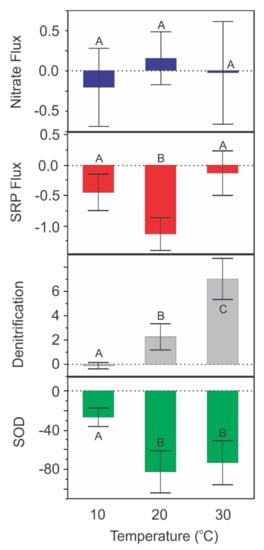 Nutrient flux vs. water temperature for nitrate (Nitrate flux, mg/m2/h), soluble reactive phosphorus (SRP flux, mg/m2/h), denitrification (mg/m2/h), and sediment oxygen demand (SOD, mg/m2/h) in sediments from Roundaway Lake, MS. Negative nitrate and SRP fluxes indicate nutrient uptake by sediments. Bars are the means and error bars are 95% CIs. Different letters indicate temperature treatments that are significantly different.