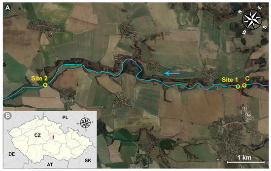 Map of the study area: (A) Locations of the sampling sites along the longitudinal profile of the Doubravka brook (in blue; flow direction indicated by the blue arrow). The contaminated drainage channel is highlighted in red. The sampling sites are shown as yellow circles: C and Site 1 = Transect 1; Site 2 = Transect 2. (B) Study area shown as the red rectangle in the Czech Republic.