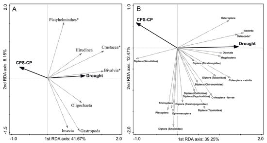 RDA ordination diagrams showing the relationships between disturbances (CPS-CP = chlorpyrifos-cypermethrin contamination derived from the chlorpyrifos sediment contamination, and Drought = drought status; see Materials and Methods) as solid black arrows, with taxa represented by grey arrowed lines. The power of the both disturbances to predict taxonomic compositions was significant (adjusted p < 0.05). The length of arrows corresponds to the quality of fit. (A) Relationships between disturbances and the composition of deeper taxonomic levels extrapolated from the abundances of all detected taxa (CPS-CP: explained variation 26.9%, pseudo-F = 3.3; Drought: explained variation 22.9%, pseudo-F = 3.7, respectively; adjusted variation explained by both predictors = 37.28%). Additional information for the labels marked by the asterisks: Platyhelminthes is represented by a single species—Polycelis nigra; Crustacea is represented by Ostracoda (not determined into a deeper taxonomic level) and Asellus aquaticus; Bivalvia is represented by only two species—Pisidium casertanum and P. personatum. (B) Relationships between disturbances and the composition of deeper taxonomic levels extrapolated from the abundances of arthropods. (CPS-CP: explained variation 24.7%, pseudo-F = 3.0; Drought: explained variation 27.0%, pseudo-F = 4.5, respectively; adjusted variation explained by both predictors = 39.65%). The asterisk marking Ostracoda indicates that this group was not determined into a deeper taxonomic level.