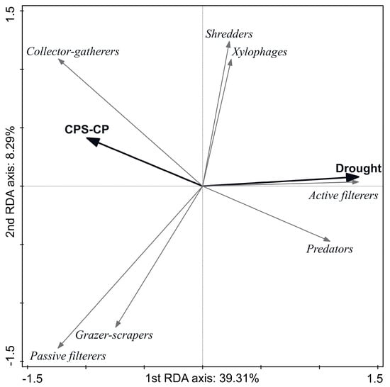 Ordination diagram showing the relationships between the average functional feeding groups (FFGs) represented by solid grey arrows and disturbances (CPS-CP = chlorpyrifos-cypermethrin contamination estimated from the chlorpyrifos sediment contamination and Drought = drought status; see Materials and Methods) represented by solid black arrows. Both disturbances have significant (p < 0.05) power to predict the FFG composition. Arrow length corresponds to the quality of fit. The FFG was extrapolated from abundances of all detected organisms (CPS-CP: explained variation 25.3%, pseudo-F = 3.1; Drought: explained variation 22.3%, pseudo-F = 3.4, respectively; adjusted variation explained by both predictors = 34.50%).