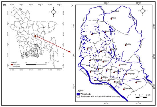 (a) Location of Dhaka city in the central part of Bangladesh. (b) Study area (Dhaka city) map with sub-administrative boundary.