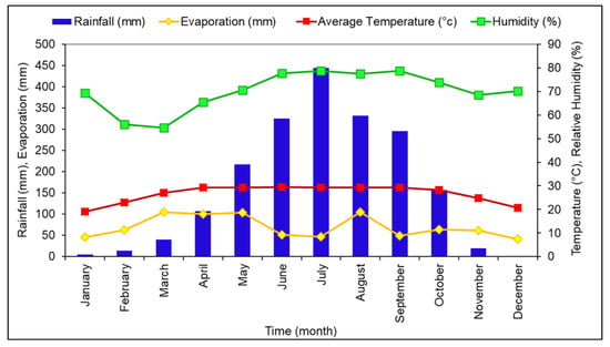 Long term (2005–2016) monthly average rainfall (mm), average temperature (°C), potential evaporation (mm) and relative humidity (%) in Dhaka city.