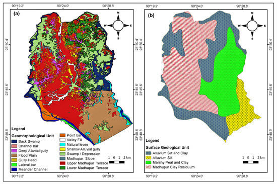 Dhaka is situated in the southern extremity of the Madhupur tract, a north–south elongated Pleistocene terrace [54] having an undulating topography, elevated from the Recent floodplain [53]. Fifteen geomorphic units have been noted, but centrally most of the parts are covered by the Madhupur terrace unit (Figure 4a). Most of the north-eastern, middle eastern and northwestern margins remarkably cover swamp or depression units. All low-lying geomorphic units, e.g., alluvial valley, active flood plain, natural levee, point bar, abandoned channel bed, swamp and depression area, have already been filled up due to rapid urban growth.