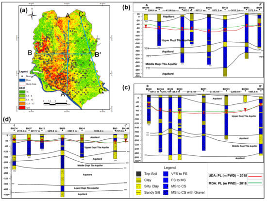 The study area has been geologically and hydrogeologically investigated by many researchers [1,41,42,43,45,70,72,75,76,77] but the geology, stratigraphy and hydrostratigraphy are not well defined because of the limited depth investigated. Almost all the investigations have been limited to the upper part of the Dupi Tila Formation (<170 m). In this study, an attempt has been made to delineate the more detailed hydrostratigraphy and aquifer geometry at a greater depth (up to 463 m). The thickness of the hydrostratigraphic units varies laterally and vertically because of surface topography and changes in the depositional conditions [71], that is, the heterogeneity of the layers [71,78]. A hydrostratigraphic reconstruction was performed based on lithologs from the Bangladesh Water Development Board (BWDB), the Department of Public Health Engineering (DPHE) and the Dhaka Water Supply and Sewerage Authority (DWASA). Golden Software’s Strater®5 was used for the interpretation of the lithology and for generating cross-sections. First, the location of the borehole logs was mapped using Strater®5. Suitable lines were chosen for the lithological cross sections. The borehole logs were then plotted along the cross-section line. The aquifers and aquitards were delineated manually, based on lithology, using the drawing option in Strater®5. Similarly, the PL in each borehole log along the cross-section was inserted and then connected manually to show the PL. The generalized hydrostratigraphy was established based on lithology and, chronologically, from the surface up to the explored depth (463 m), the units are: localized shallow aquifer, aquitard, Upper Dupi Tila Aquifer (UDA), aquitard, Middle Dupi Tila Aquifer (MDA), aquitard, Lower Dupi Tila Aquifer (LDA) and aquitard.