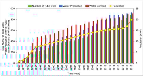 The groundwater exploitation scenario is directly linked with the population of the area, urbanization and city expansion. In Dhaka city, groundwater extraction has been reported since the 16th century: Guru Nanak sunk a dug well due to the scarcity of water [82]. In the 1980s, dug wells were also used as a source of drinking water, and still today some dug wells are found in the alluvial cover on top of the Madhupur Clay. In 1874, Nabab Khaja Abdul Ghani first established a water treatment plant in the Chadnighat area near the bank of the river Buriganga to supply water to Dhaka city [45]. The DPHE introduced groundwater development for a public supply and drilled the first borehole in Dhaka in 1941 [45,57]. Then the use of groundwater increased gradually over time as a source of water production [45]. Since 1963, DWASA has been continuously expanding its coverage area with updated services [45,57]. Figure 6 shows the development of production wells, along with water demand and production and population with time. The independence of Bangladesh in 1971 prompted the advance and development of the groundwater supply [30]. The city had a population of less than two million and groundwater abstraction was less than 50 × 106 m3/year during that time, and only 47 DWASA deep tube wells (DTWs) were operating [26]. From 1970 to 1985, almost all the DTWs were installed in UDA in the vicinity of the rivers Buriganga and Turag, whereas later on, well construction spread to the center and the northern part of the city. In 2000, the population increased to almost 10 million. DWASA installed a total of 308 DTWs with 413 × 106 m3/year production capacity, but demand was 548 × 106 m3/year. In addition, more than 900 private deep wells (with a minimum of 0.057 m3/s discharge) were also operating in the UDA [46]. Since 2004, DWASA has drilled wells to larger depths (>170 m) in MDA and LDA [80] because of the huge drop in the PL of UDA. In 2013, the supply capacity was raised to 883 × 106 m3/year through the use of 644 DTWs and four water treatment plants [26]. In 2018, the population increased to 20 million. To meet the water demand, both the production capacity (931 × 106 m3/year) and the number of DTWs (887) were increased [26].