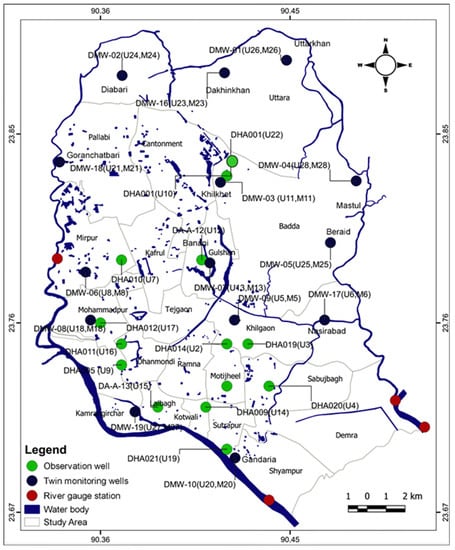 - Ahmed, K.M.; Islam, M.S.; Sultana, S.; Ahmed, S.; Rabbani, G. Changes in the Groundwater Regime of Dhaka City: A Historical Perspective; Environment of Capital Dhaka-Plants Wildlife Gardens Parks Air Water Earthquake; Asiatic Society of Bangladesh: Dhaka, Bangladesh, 2011; pp. 383–400. [Google Scholar]