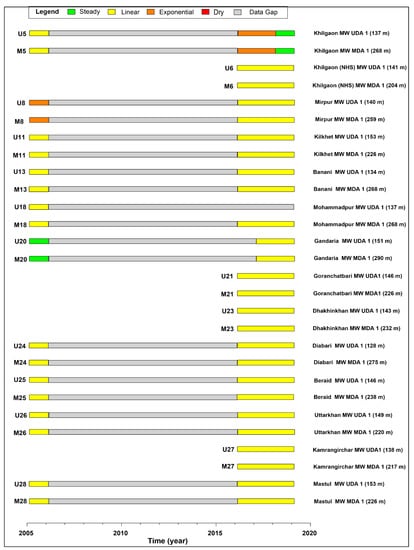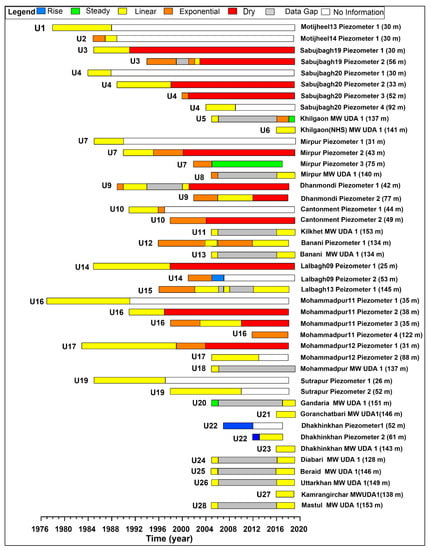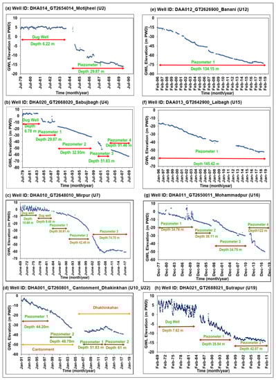 The old part of the city was developed in the vicinity of the Buriganga and Turag rivers and, therefore, most of the observation wells are situated in the south-central and western parts of the city. However, twin wells are situated sparsely throughout the city and show the changes of PL in peripheral and central parts of the city. In Dhaka city, most of the observation wells show a continuously declining trend (Figure 8).