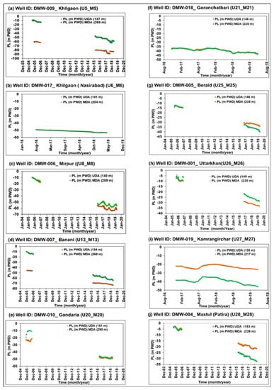 In 2018, the PL was −71.24 and −61.5 m PWD for UDA and MDA, respectively. The Nasirabad (southeast), Gandaria (south west) and Goranchatbari (central west) twin wells showed linear declines since 2016 but both aquifers’ hydrographs were almost coinciding and parallel to each other. In 2018 in Gandaria, the PL was −48.75 and −48.23 m PWD, whereas in Goranchatbari the PL was −40.12 and −40.32 m PWD for UDA and MDA, respectively (Figure 9e,f)). Most of the twin hydrographs suggest that the declining rate was higher in MDA than in UDA from 2016 to 2018 (Table 1, Figure 9), not only in the central region but also in the peripheral region (Figure 9g,i,j), because in this period the abstraction increased for MDA and decreased for UDA. In 2018, the PL values of Beraid (central east), Mastul (central east) and Kamrangirchar (south west) were observed to be −32, −20.91 and −21.34 m PWD in UDA, respectively, whereas they were −36.5, −30.24 and −37.60 m PWD in MDA, respectively. The lowest level of decline in UDA was observed in Mastul (−20.91 m PWD), and in MDA it was in Uttarkhan (northern) area (−26.76 m PWD) in 2018.