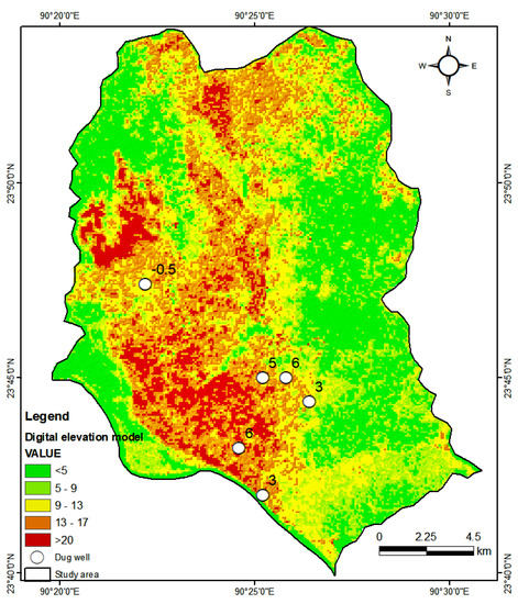 The surface geology mainly follows the geomorphic expression of the area (Figure 4b) and is classified into four broad categories: Madhupur Clay residuum, Alluvium silt and clay, Alluvium silt, and Marshy peat and clay. From a geological and geomorphological perspective, the city mainly covers two broad geomorphological units. One is high lands, which correspond to Madhupur terrace, and the other is lowlands, which correspond to alluvial deposits, mainly comprising swamp or depression, back swamp, channel bar, flood plain and valley fill units [68,69]. The relatively flat topography also perfectly resembles the geomorphic features of the area. The western part is marked by an abrupt change in elevation, whereas relatively gentle slopes are maintained in the eastern part. The surface elevation of gullies, valleys and bars is somewhat higher (>9 m) in the southwestern and northeastern parts than in the floodplain, depressions and abandoned channels, but the undulating topography was mainly created or developed by the rivers Buriganga, Balu and Turag. The general slope of the land surface is from north to south, more specifically towards the southeast, in which ground surfaces merge with the Recent floodplain of the rivers Buriganga, Balu and Shitalakhay. The elevation differences are remarkably reflected by distinct landforms: a high elevation is observed in the Madhupur terraces region, normally ranging from 15 m to >20 m above mean sea level (amsl), and a low elevation (<5 m amsl) is observed in the floodplain, depressions and abandoned channels (Figure 5a).