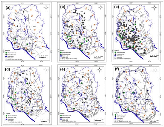 Piezometric maps of Upper Dupi Tila aquifer (UDA) in Dhaka city. (a) 1980, (b) 1990, (c) 2000, (d) 2010, (e) 2015, (f) 2018.