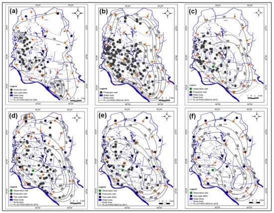 In 2005, the shape and extent of depression showed sporadic patterns and was centered at the DTWs’ locations, as the drilling in MDA by DWASA had started in 2004 [80] (Figure 12a). The locations where the depression cones were centered include the Shympur and Sabujbagh areas in the southeast part of the city (−36.82 m PWD), Mirpur and Pallabi areas in the northwestern part (−34.62 m PWD) and the Dhanmondi area in the southwest part of the city (−21.35 m PWD). The PL contour of −10 m PWD covered most parts of the city except the northern extremities. The shape, extent and magnitude of the depression cone changed remarkably in the year 2010 (Figure 12b). The lowest PL elevation at −68 m PWD was centered in the central part and mainly covered the Banani and Gulshan areas, and partly covered the Tejgaon, Ramna, Motijheel and Sabujbagh areas. The PL elevation contour of −25 m PWD covered most of the city. In 2015, the extent of the depression cone increased compared to 2010 (Figure 12c). The magnitude of the depression was at −69.61 m PWD and the areas severely affected by PL decline included the Gulshan, Badda, Khilgaon, Motijheel and Sabujbagh areas. The PL depression contour of −45 m PWD covered most of the city. The depression contour pattern for 2016 was similar to that of 2015 but the depression cone extended towards the west-central part of the city (Figure 12c). In 2017, the lowest PL at −72.76 m PWD was observed in the southeast part of the city (Manda area) (Figure 12e). Practically, there were no differences in the depression contour patterns for 2018 and 2017, except that the extent of the depression contour −70 m PWD was larger in 2018 (Figure 12f). The PL contour of −35 m PWD covered the peripheral part of the city. The direction of the groundwater flow was obviously from the peripheral part of the city towards the center of the depression cone in the south-central to the south-eastern part of the city.