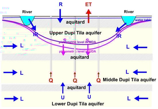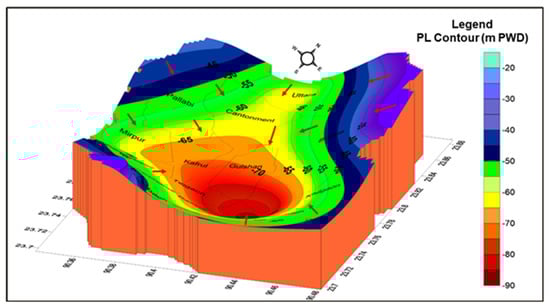 The depression cones reflect the pattern of change of groundwater extractions and city expansion in different time periods (Figure 2 and Figure 6). Massive and continuous extraction has modified the directions of groundwater flow by reversing hydraulic gradients towards the central and south-central to southeast parts of the city, where the lowest depression was noticed in both aquifers [89]. The 3D models of both aquifers show the radial flow towards the center of the depression cones in Dhaka city (Figure 15 and Figure 16). These two models illustrate the lateral and vertical spread of depression cones and the peripheral piezometry in the UDA and MDA in Dhaka city.