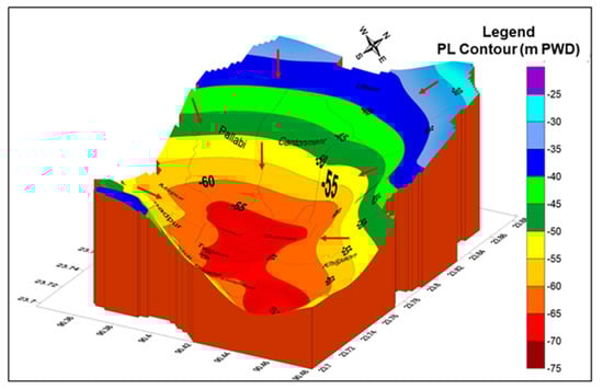 The shape, extent and magnitude of the depression cone changed significantly in the year 1990 (Figure 11b). The cone covered a larger area than in the past and the lowest depression was further extended to the southeastern part of the city, in the Sabujbagh area, where the lowest PL was observed at −17.57 m PWD. The PL elevation contour −15 m PWD covered most of the Sabujbagh and Khilgaon areas, and part of the Motijheel area. The declining trend of PL influenced the south-central part of the city and the influence of the depression was evident laterally up to the northwestern part (Cantonment). In 2000, the magnitude of the depression cone changed dramatically, and a notable change in the PL decline was observed in most parts of the city, except the northeastern part. The depression cone extended in a southeast–northwest direction (Mirpur area); the lowest elevation contour at −45 m PWD apparently covered the Ramna, Motijheel and Khilgaon areas and the peripheral part of the city was covered by a −5 m PWD contour (Figure 11c).
