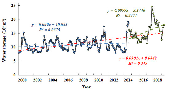 Monthly average reservoir storage change trend from 2000 to 2019.