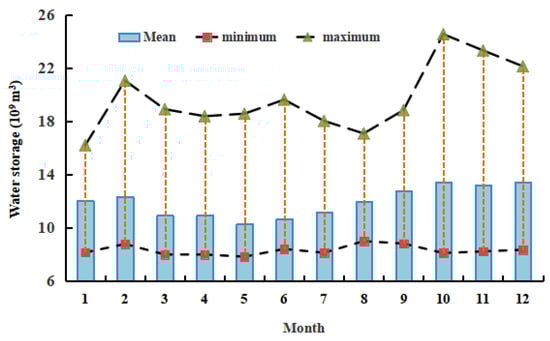 Figure 4 shows the monthly average reservoir storage change for many years. From October to December, the maximum monthly reservoir storage was more than 2.2 × 1010 cubic meters, and the values in other months were equal or less than 2.2 × 1010 cubic meters. The reservoir storage reached 2.2 × 1010 cubic meters a total of 17 times, the frequency of reaching this reservoir storage in each month was as follows: 2 in September, 5 in October, 4 in November, 4 in December, and 2 in January, which shows that the maximum reservoir storage appeared most frequently from October to December. The minimum monthly reservoir storage had no obvious fluctuation, with a value range of 7.9–9 × 109 cubic meters. The average monthly reservoir storage showed a trend of first decreasing and then increasing. It gradually decreased from January to May and increased significantly from June to October, reaching a maximum reservoir storage of 1.34 × 1010 cubic meters at a rate of 7.08 × 108 cubic meters per month; finally, the value remained unchanged from October to December. The correlation coefficient between the monthly maximum reservoir storage and the monthly average reservoir storage was 0.85.