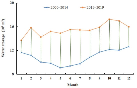 Monthly average reservoir storage change from 2000 to 2014 and from 2015 to 2019.