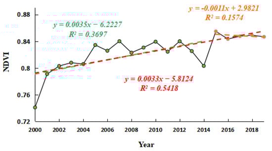 The NDVI in the study period was selected to monitor the change in vegetation cover (Figure 6). From 2000 to 2019, the average annual NDVI of the Hanjiang River basin showed an increasing trend, with a growth rate of 3.3 × 10−5/year. The minimum annual NDVI value appeared in 2000 (NDVI = 0.74), and the maximum value appeared in 2015 (NDVI = 0.85). The increasing NDVI trend was obvious from 2000 to 2007, and the change trend was gentle from 2008 to 2019. However, the NDVI decreased significantly from 2012 to 2014.