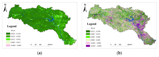 (a) Spatial change in the NDVI from 2000 to 2014; (b) spatial change in the NDVI from 2015 to 2019.