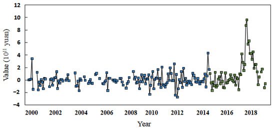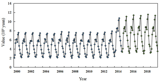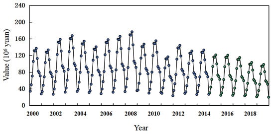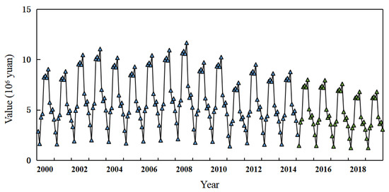 Based on the monthly water storage, rainfall, evaporation of the Danjiangkou Reservoir, the monthly water supply to the city, especially from the middle route of the SNWD, and the unit capacity cost of the Danjiangkou Reservoir (the total investment in reservoir construction was 2013 billion yuan, the capacity was 29 billion cubic meters, and the unit capacity cost was 6.94 yuan/cubic meter) were used to calculate the value of water conservation and supply in 2000–2019 (Figure 11).
