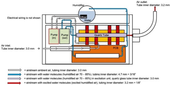 Figure 1). The device consists of a humidifier, excitation unit and a control unit. The method involves humidification of the carrier air with water microdroplets, irradiating it with infrared electromagnetic energy and treatment of bulk water or other objects with the irradiated humid air. Unpurified ambient air with initial humidity of 25–30% is used as the carrier gas. The pump (in) takes in ambient air and presses it through the diffuser to water in the humidifier glass container. The pump (out) takes the humidified air above water in the humidifier glass container and presses it through the quartz glass tube of the excitation unit. Each pump creates an air output of 3–4 L per minute. The pump membrane is made of medical grade silicon rubber. The humidified airstream (70–85% humidity) goes to the excitation unit equipped with 24 LEDs, a heat sink element and a thermo sensor. The humid air goes through a 40 mm long quartz glass tube with an inner diameter of 3 mm. Within the glass tube, the water vapor absorbs energy that is emitted by the LEDs placed around the tube at a distance of 2.3 mm. The diameter of each LED is 4.7 mm, and they emit IR energy at about 4000 nm with a beam cone of 30°and the output power of 700 pW. The control unit allows to switch the LEDs off and to obtain the non-irradiated humid air for control measurements. After exiting the excitation unit, humid air exits the device through the 70 cm long flexible plastic outlet with the inner diameter of 3.2 mm.