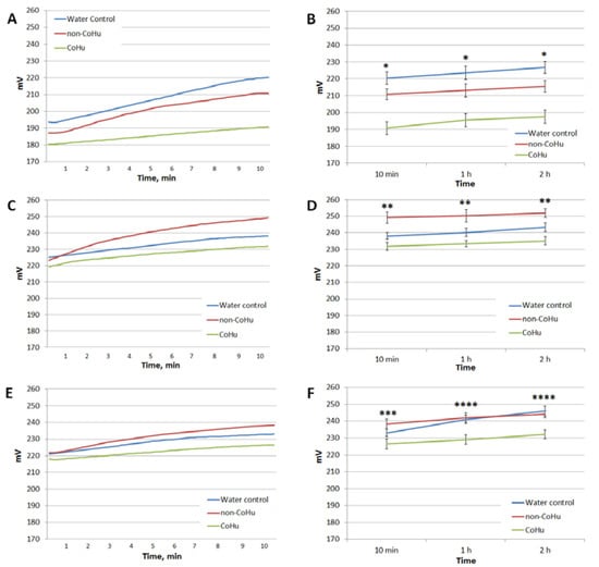 Figure 2). Untreated control pure water had lower redox potential compared to untreated control mineral waters. Treatment of all types of water with CoHu for 2 min led to a redox potential decrease in all types of water, and this trend remained the same during the whole measurement. In samples that were treated with non-CoHu, redox potential increased in Senezhskaya and BioVita waters, while in pure water, a slight decrease was observed. The redox potential decrease indicates that water treated with CoHu may possess antioxidant properties. The redox potential of the aqueous medium in living organisms is usually lower than in environmental water. Interestingly, redox potential of EZ water formed at the surface of hydrophilic powder also showed a decrease [