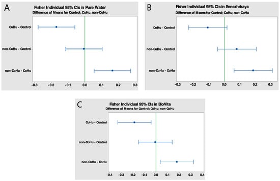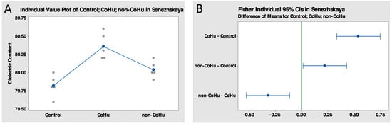 Figure 6) waters with CoHu, a tendency for the increase of the dielectric constant in all these waters was observed. Fisher pairwise comparison showed also that in pure water and Senezhskaya water, both CoHu-treated samples and non-CoHu-treated samples had higher mean dielectric constant values. In BioVita water, both CoHu-treated samples and non-CoHu-treated samples differed from untreated water however they did not differ from each other. Dielectric constant indicates the ability of the liquid to weaken the external field. Pure and mineral waters interact with the field and weaken it almost 80 times. The increase of the dielectric constant was slight, though may be indicative of the increased charge storage capacity and the dipole moment of the whole sample or some zones in them.