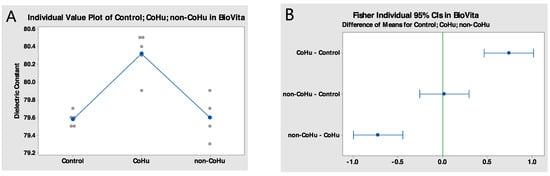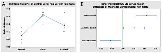 Dielectric constant in pure water and mineral waters, along with samples treated with CoHu and non-CoHu, was measured using the Brookhaven Instruments BI 870 dielectric constant meter at 25 °C with 2% accuracy at 10 kHz. The measurements were repeated 3 times for each group of samples and controls. Treatment with CoHu or non-CoHu was in 10 mL liquid samples during 2 min.
